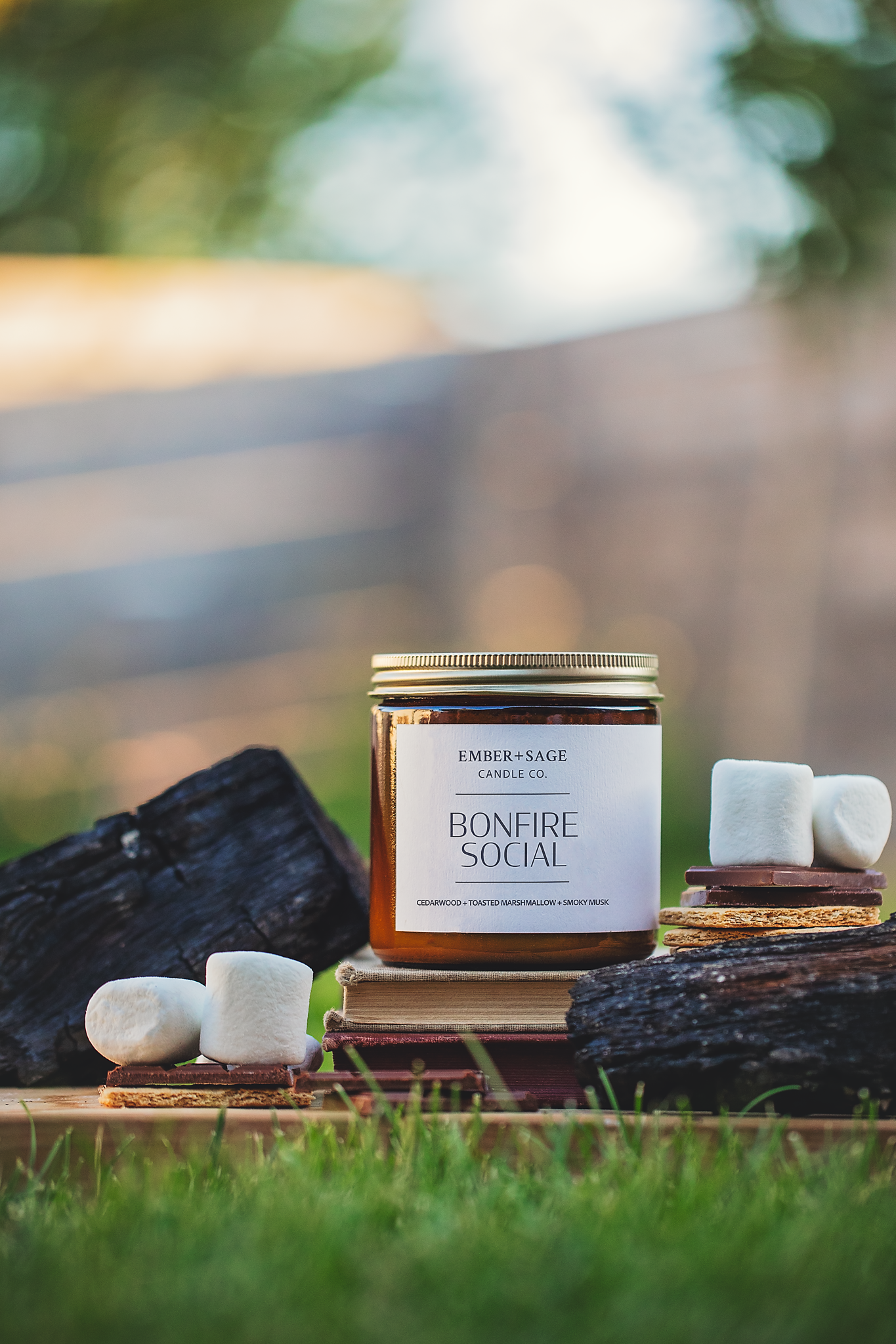 A crackling fire, shared stories, sticky marshmallows + laughter floating into the night sky. This scent captures the heart of small town gatherings: unforgettable nights spent where the stars are close + the friendships are even closer.