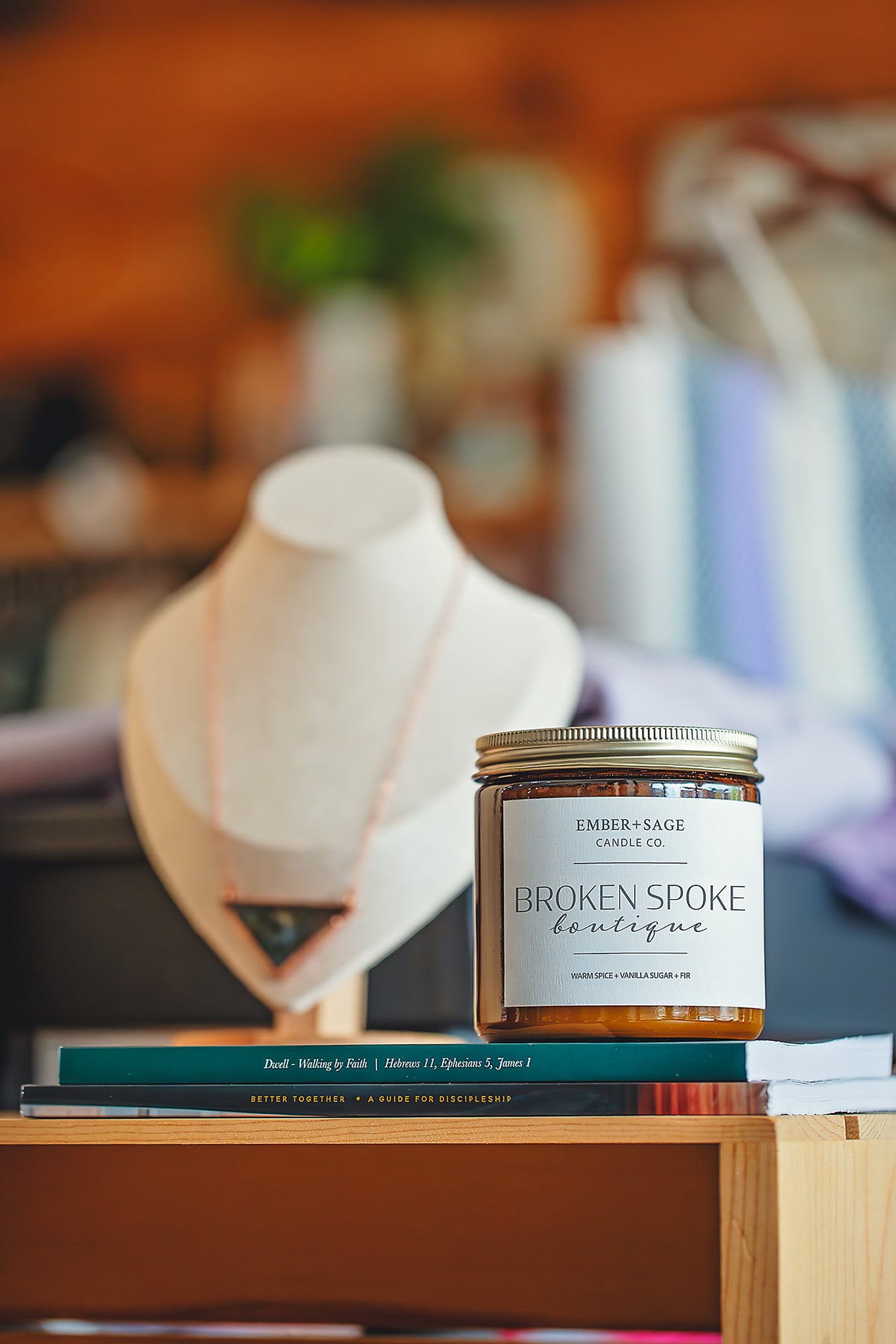Nestled inside a beautifully restored historic bank, Broken Spoke Boutique is layered in story: shiplap walls, hand-laid brick vaults, worn hardwood + hexagon tile flooring that echo decades of design. This signature scent blends warm spice, vanilla sugar + a hint of fir, capturing the richness of aged wood, the soft elegance of curated style + the welcoming heart of an amazing place where history meets modern.